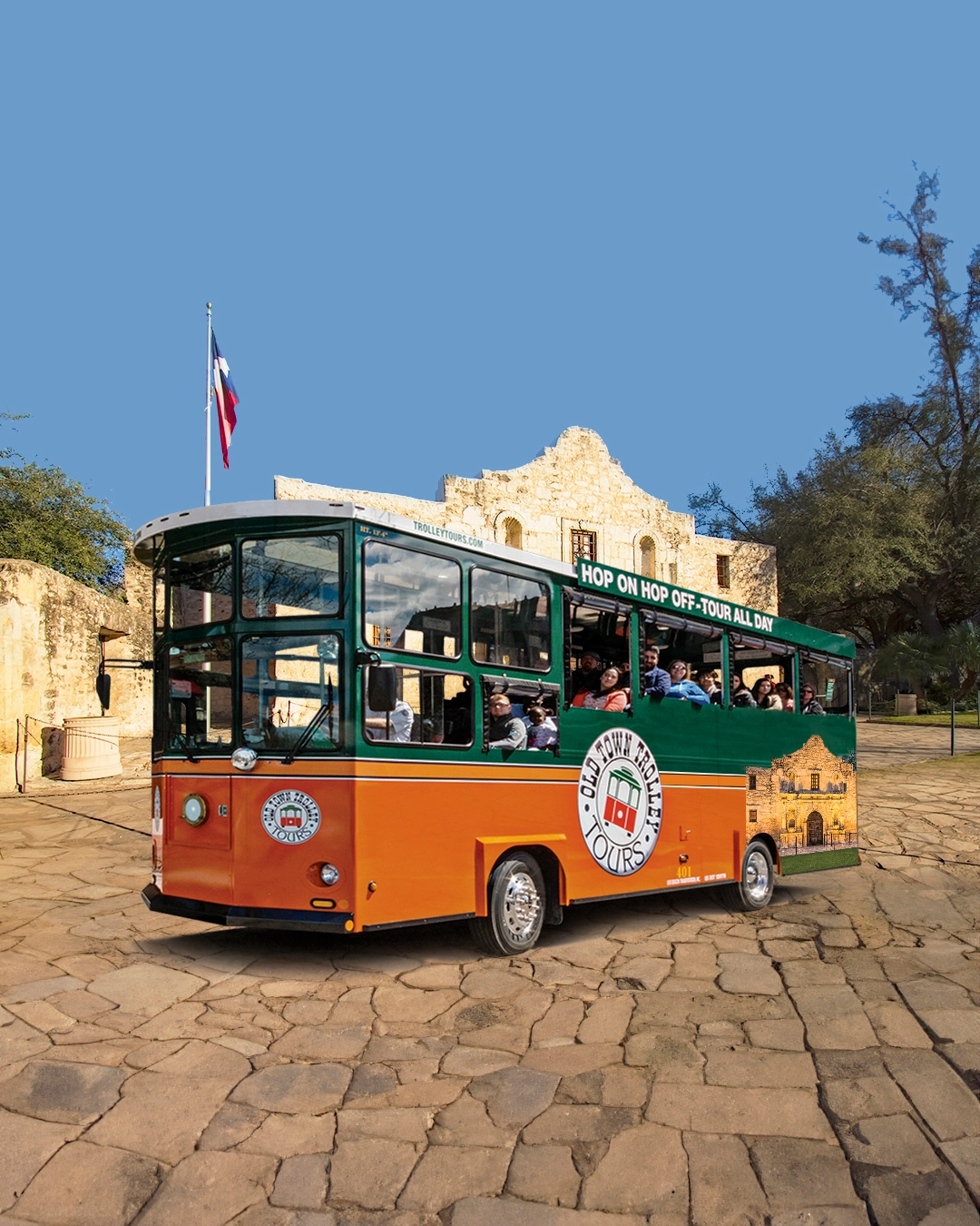 Departure Point: Stop No. #1 Alamo Plaza (located in front of the Ihop next to the Rivercenter Mall parking lot.)